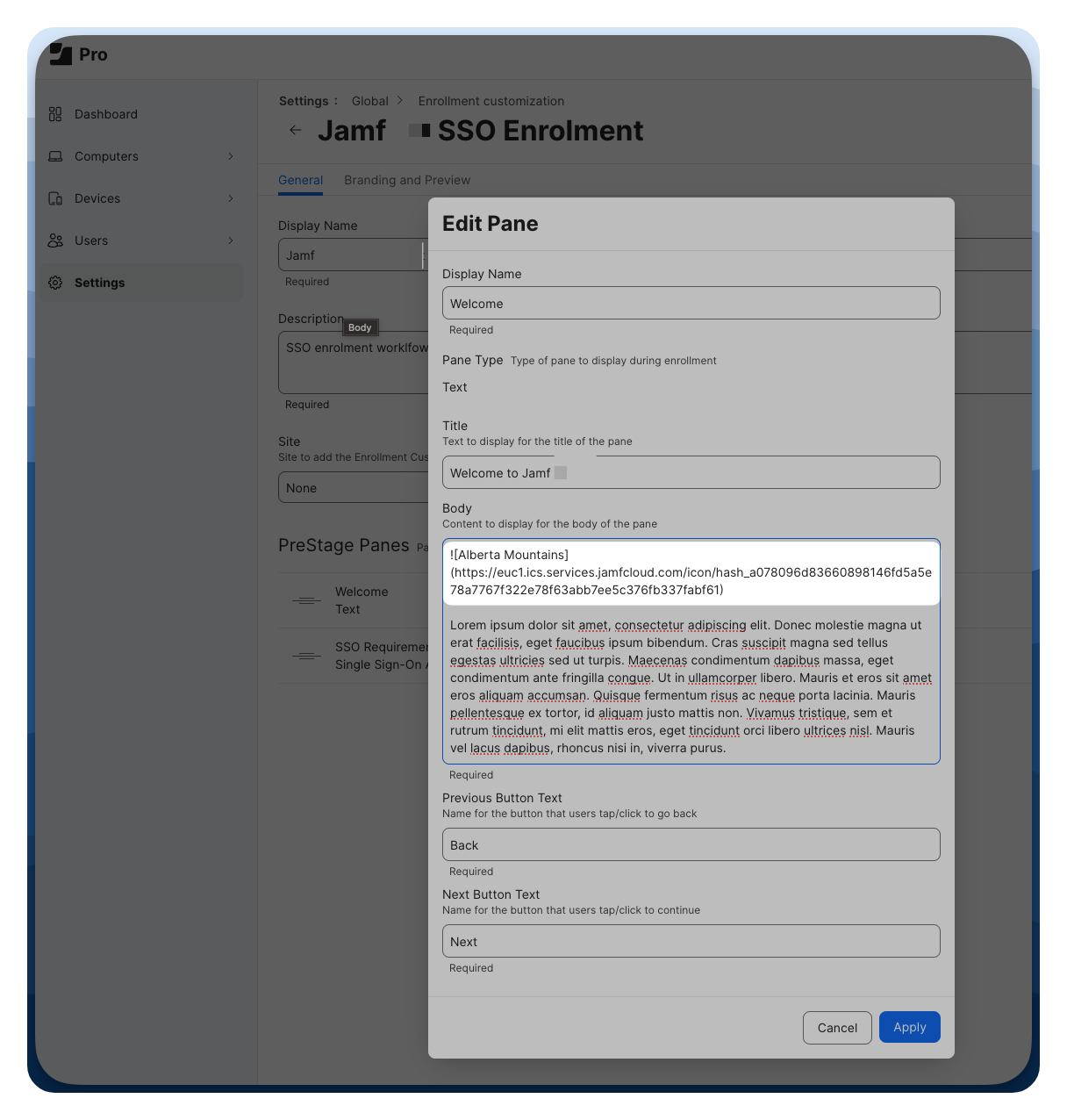 I setup two panes, the welcome text and an SSO requirement. I wanted to include a nice image of the Alberta Rockies, a small yet beautiful image of the Rockies to zen anyone trying to enrol a device.